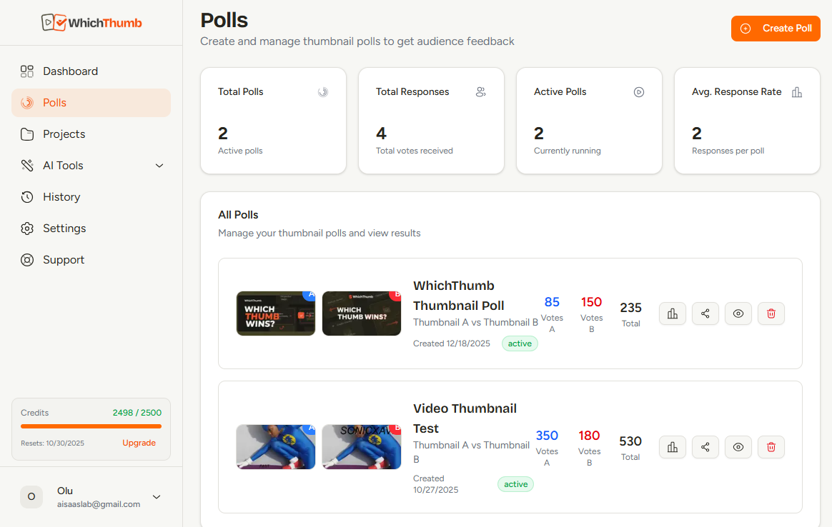 Create polls with multiple thumbnail options and let your actual audience vote. See which thumbnail people prefer before you publish—no guessing, just real data from real people.